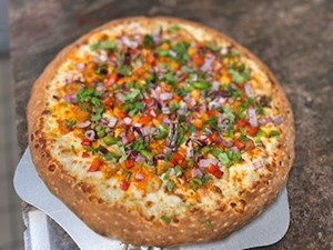 White sauce, mozzarella, crispy buffalo chicken, bell peppers, onions and fresh cilantro