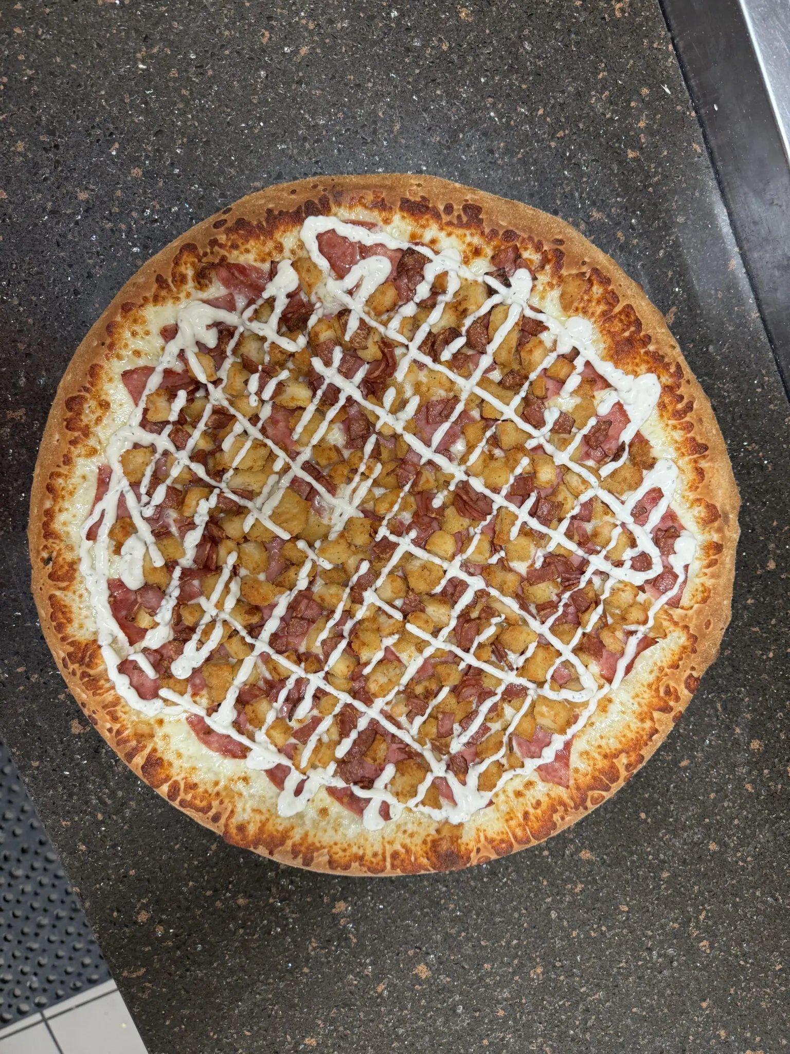 Turkey bacon and Canadian bacon, crispy chicken, and mozzarella topped with ranch drizzle.