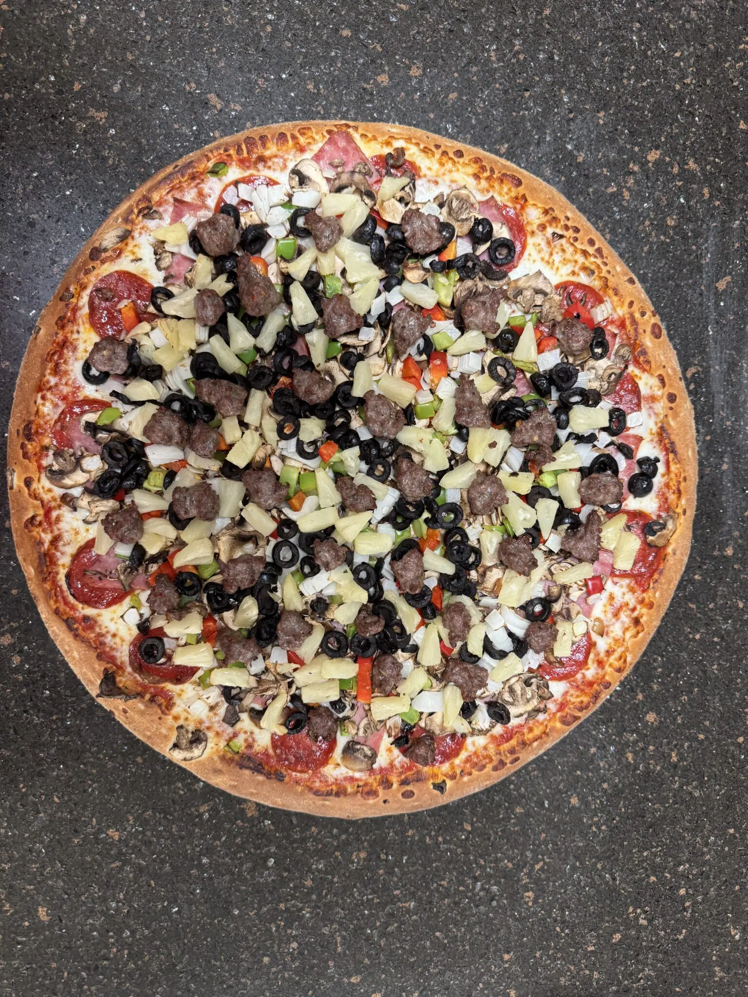 Pizza sauce, Pepperoni, sausage, turkey Canadian bacon, mushroom, olives, bell peppers, onion, mozzarella and pineapple.